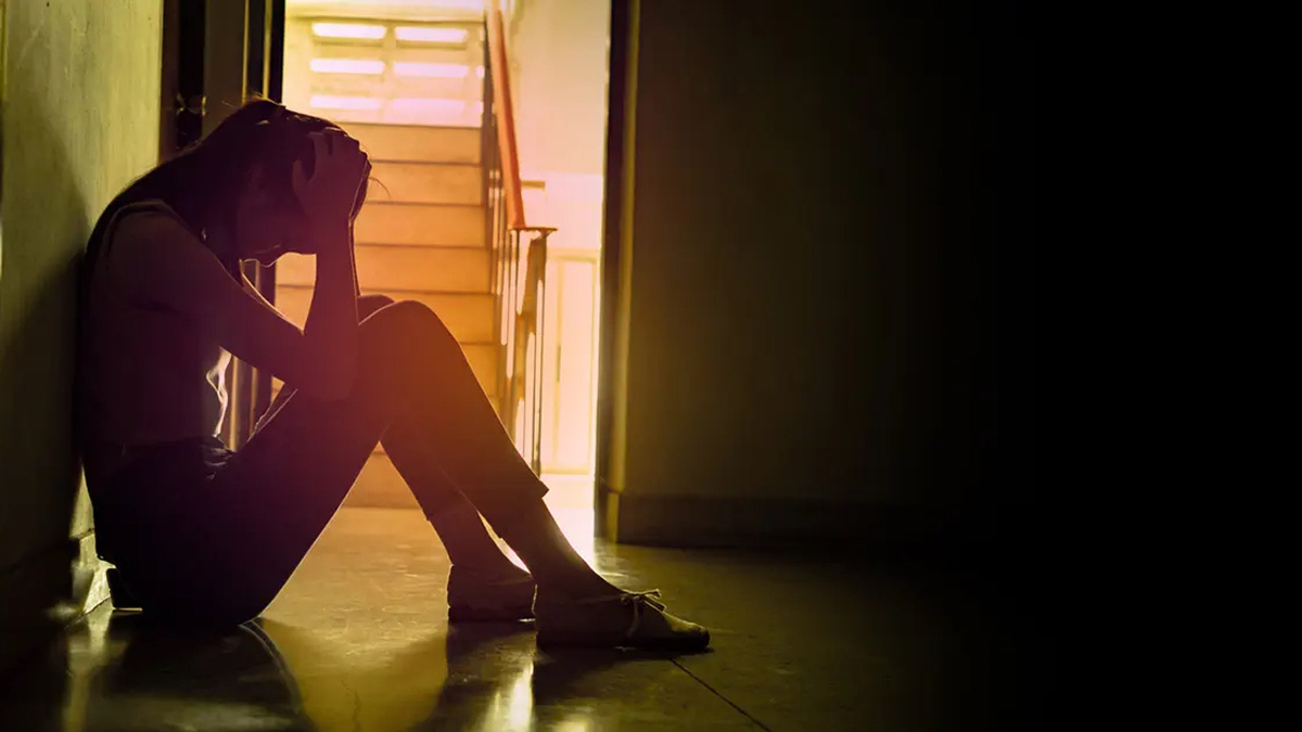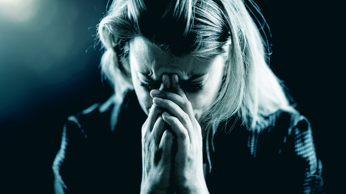 Woman with her hands pressed to her temples