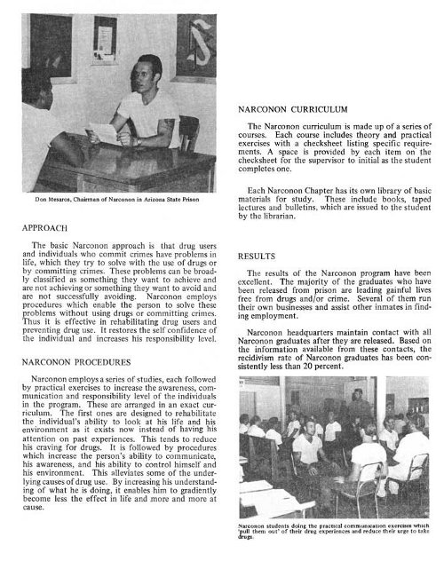 With help from John Russell, a construction foreman at Arizona State Prison and the Rev. Peter Greene, in Phoenix, he requested permission from cooperative prison officials to form a group to apply what he had learned. His request was approved and he formed a group of twenty members. They began studying and applying the practical procedures from the books, and achieved good results. Other inmates heard of the group and asked to join. It grew and another one was formed in a separate part of the prison. Today over 70 Narconon graduates have been released from prison. Most of them are leading productive lives–free from drugs. Word of Narconons success spread to other penal institutions. In 1970 some inmates at the California Medical Facility at Vacaville requested a Narconon program. Soon thereafter one was started by the Rev. Vaughn Young. This group has flourished. Another was started in San Jeronimo prison in Mexico City and is doing very well. Additional requests have come in from institutions in the U.S. and all over the world, and Narconon programs are going in.