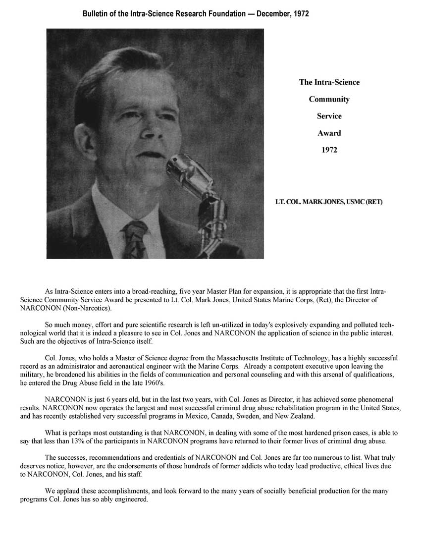 As Intra-Science enters into a broad-reaching, five year Master Plan for expansion, it is appropriate that the first Intra-Science Community Service Award be presented to Lt. Col. Mark Jones, United States Marine Corps, (Ret), the Director of NARCONON (Non-Narcotics).