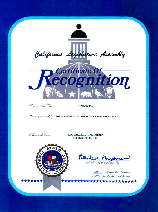 Certificate of Recognition - Presented to Narconon